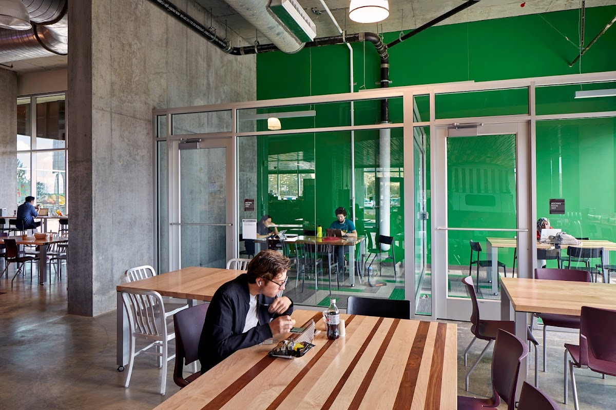 The atmosphere leans toward functional and modern rather than cozy or lounge-like. Seating options include a mix of bar tables and regular spots, accommodating both quick solo visits and small groups catching up between errands or classes. It’s the kind of place where grabbing a bite between morning lectures or afternoon meetings feels natural, with the buzz of a university building humming quietly in the background.