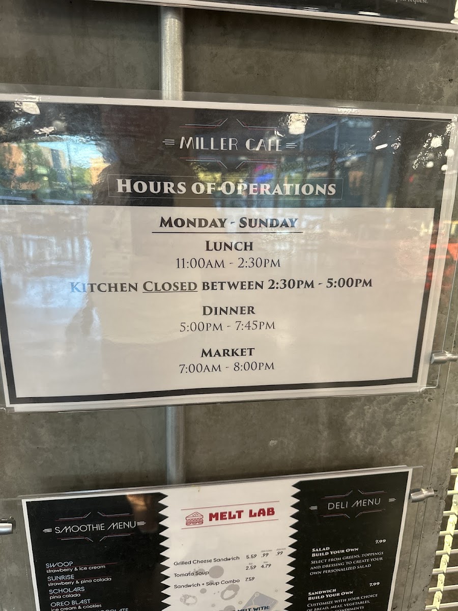 Overall, the menu supports meal occasions from breakfast to light lunches and snacks, fitting the needs of students and visitors seeking a convenient dining option on campus.